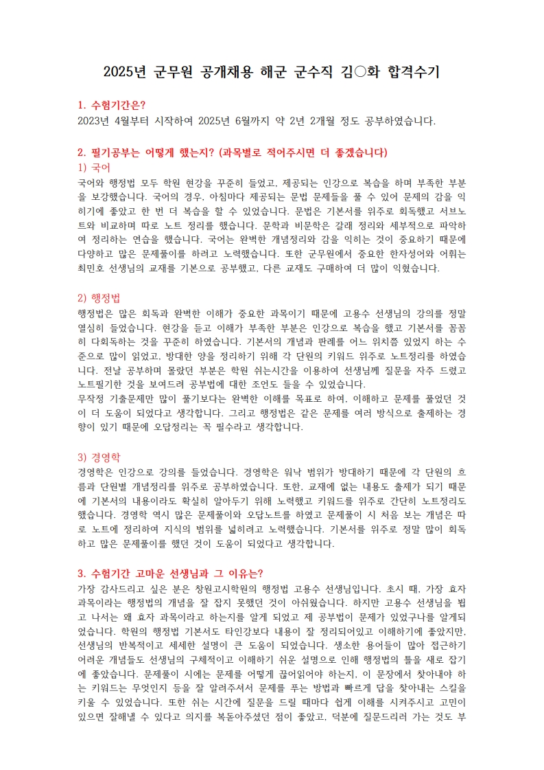 2025 군무원 공개채용 해군 군수직 김O화 합격수기